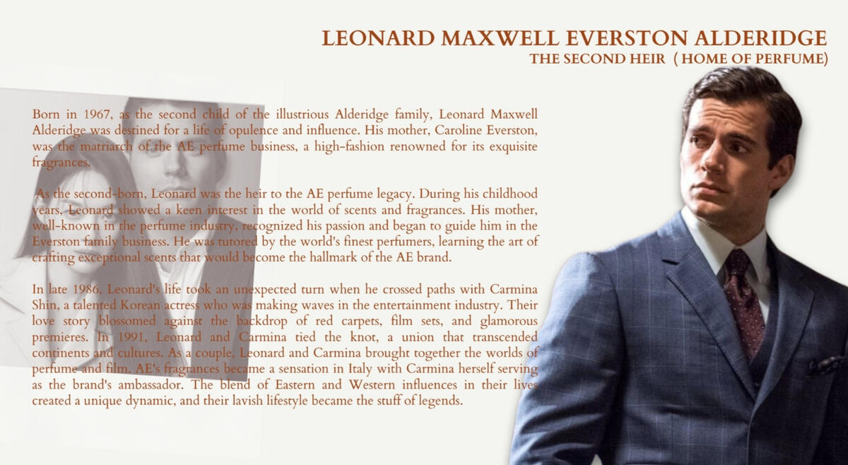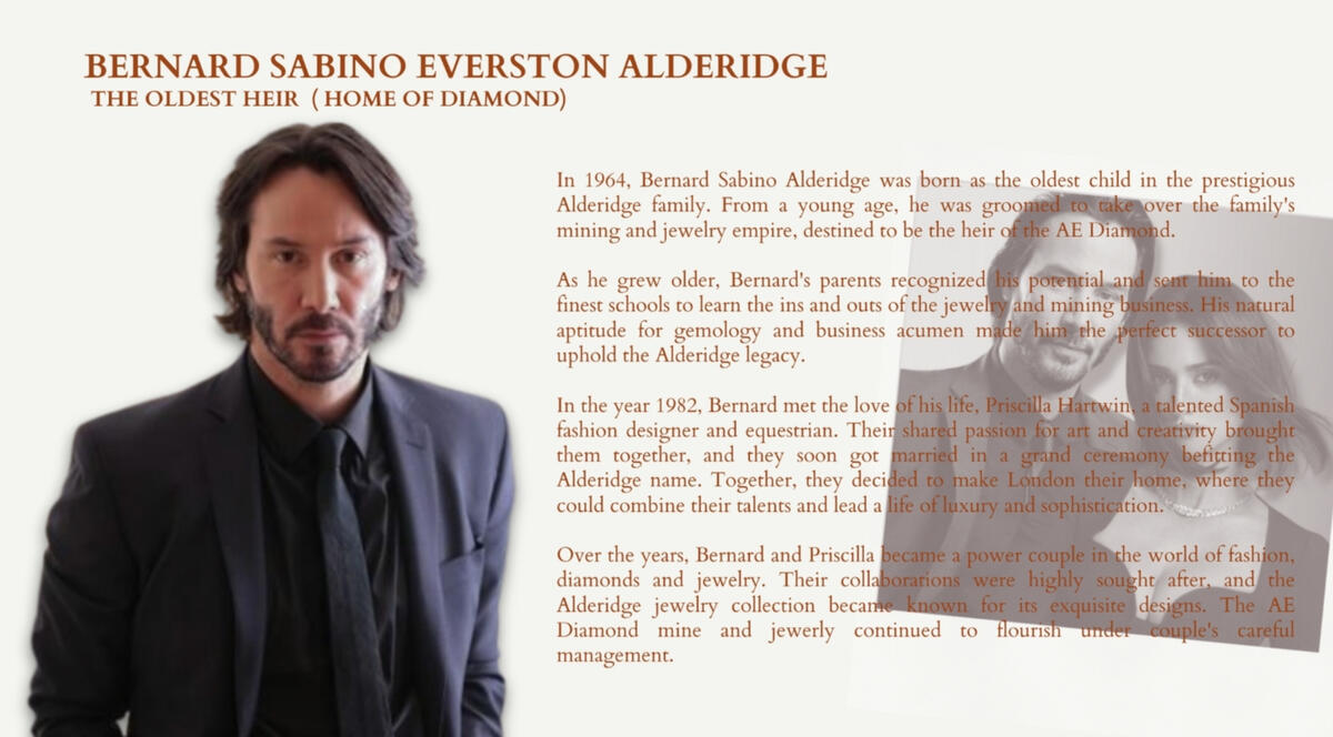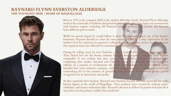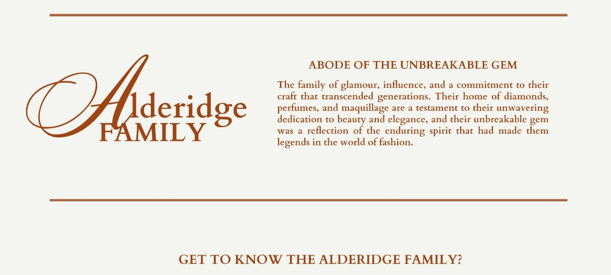 The Alderidge family is a distinguished and multifaceted dynasty, at the helm of an empire that includes their renowned AE Diamond mining operation, the exquisite AE Perfumes line, and the flourishing AE Cosmetics business.Their legacy is built upon the foundation of the AE Diamond, where they have consistently demonstrated their mastery in the extraction and refinement of some of the world's most exquisite gemstones and handcrafted jewerlies.In the world of fragrances, the AE Perfumes brand is a celebrated name, known for its artistry in crafting scents that captivate the senses and define sophistication. Their commitment to the world of perfumery has resulted in an array of fragrances that are coveted by those who appreciate true artistry in scent.The Alderidge family's influence doesn't stop with their own businesses. They have left an indelible mark on the fashion world, establishing themselves as trendsetters and tastemakers, AE Maquillage.What sets the Alderidge family apart is their individual talents and pursuits. Each member of the family has honed their unique passions and excelled in their chosen fields, whether it's cosmetics, fashion, or other creative endeavors. This diverse range of expertise underscores their commitment to excellence, both within their established businesses and in their personal pursuits.